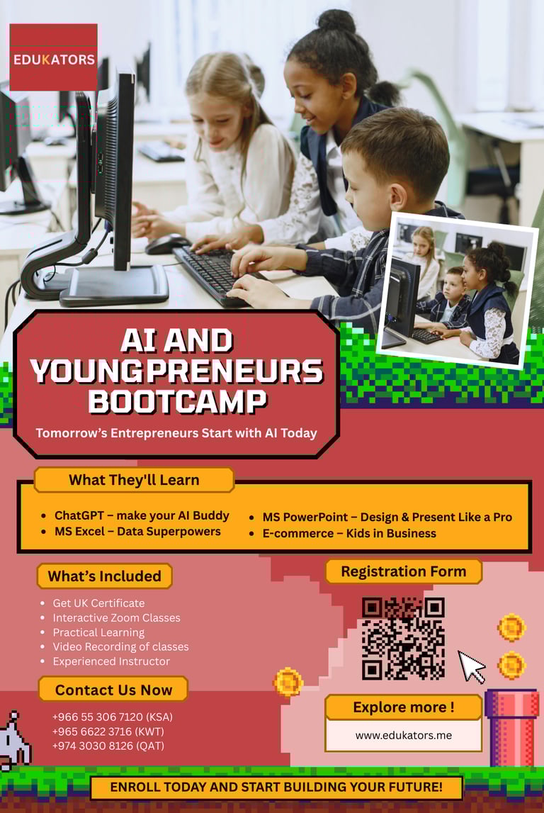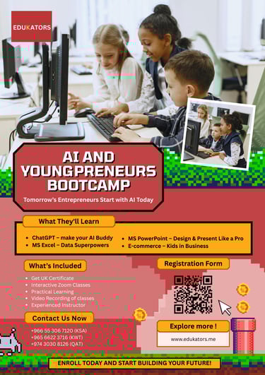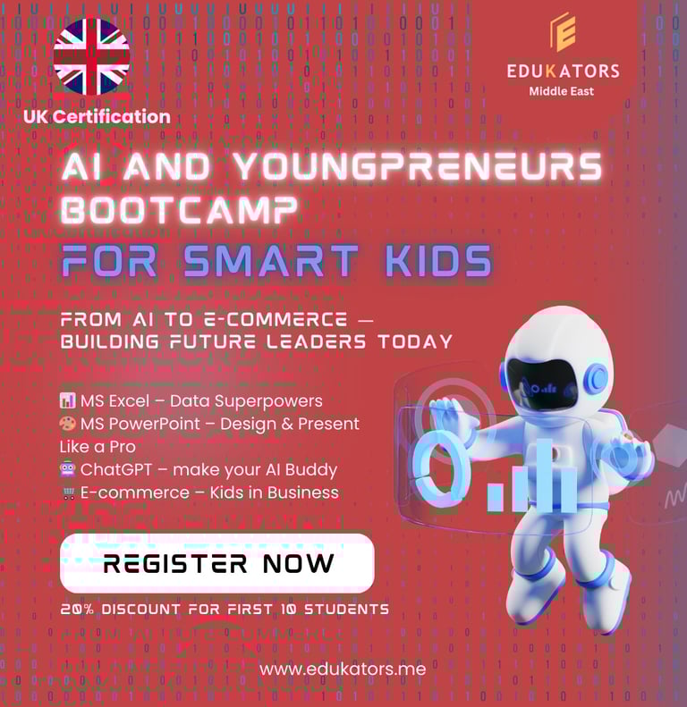 This bootcamp empowers children to explore the world of Artificial Intelligence, Business, and Digital Tools in a fun and practical way. By the end of the program, they’ll not only master digital skills but also gain the confidence to use them as budding entrepreneurs.